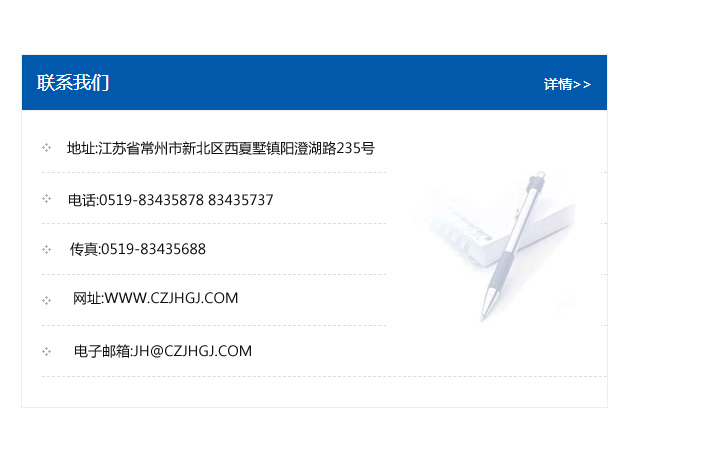 地址:常州市新北區友邦商務大廈1幢16、17層  電話:0519-85101652  傳真:0519-85112595  郵編:213022  網址:www.cz-jiayue_cn.chinahaichi.com  郵箱:xiajifengaa@163.com